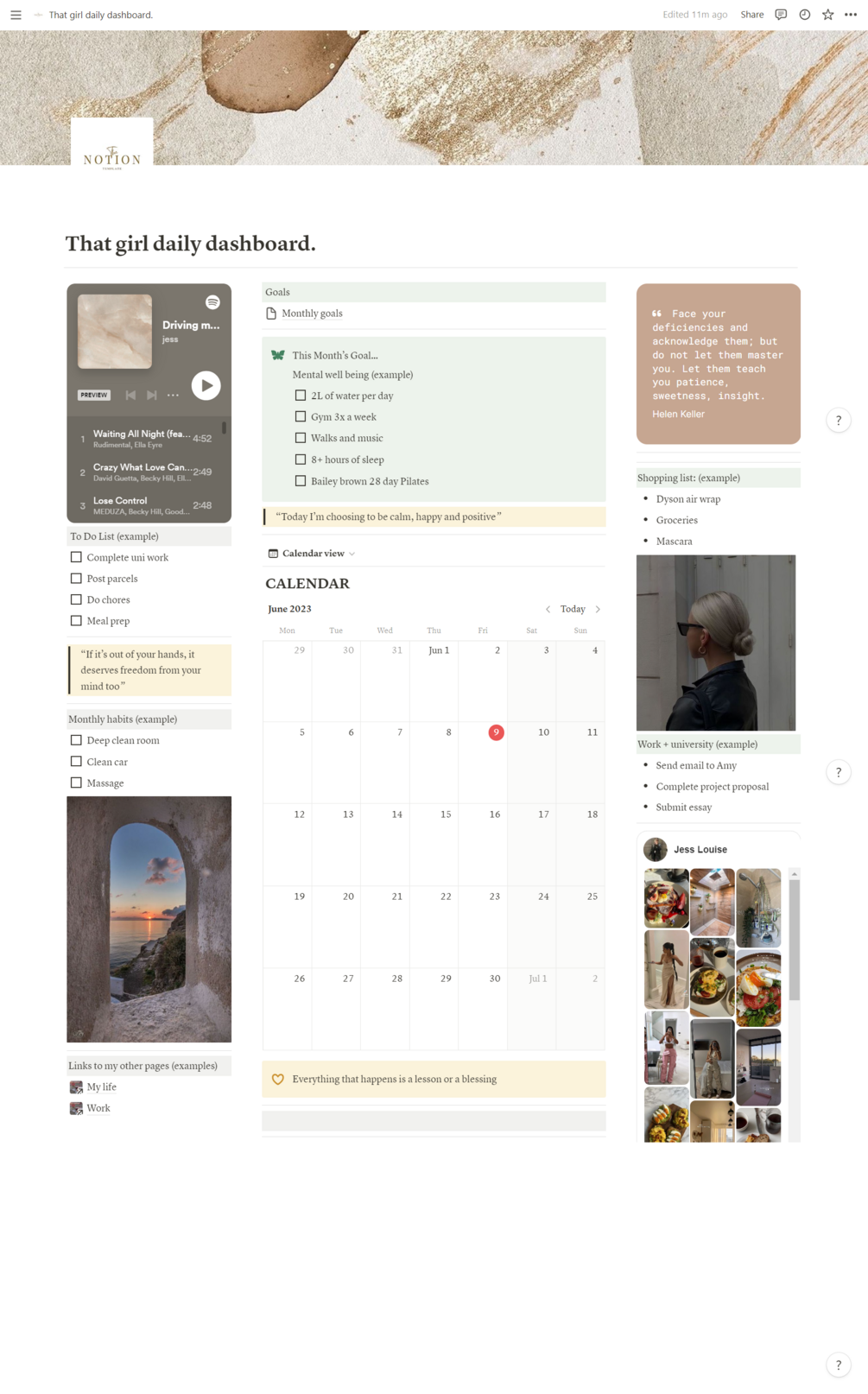 'That girl' daily dashboard including a calendar, to do lists, quotes, shopping list, habits and goals, and links to Spotify and Pinterest. Everything on this template is adjustable from colours and photos ton links and pages attached. The only thing you need to get your life together! Includes a how to use guide.